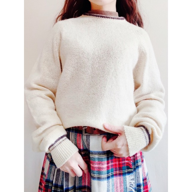 イングランド製。 “Duke of marlborough” おそらく70年代頃の物かと思います☽☽☽ 首、袖、裾にラインがはいったデザインの とってもシンプルなニットです。 わりと薄手でさらりと着て頂けるかと思います◎ ▷size(平置き) S 着丈:61㎝ 身幅:48㎝ 裄丈:95㎝ 多少の誤差はご了承ください。 (着用画像:身長153㎝) ▷color オフホワイト×グレー(よく見ると少しオレンジなどが混ざったミックスカラーです) ▷fabric ウール 55% アクリル 45% ▷condition 目立つ傷や汚れはありません。 画像でご確認ください。 ◯ダメージ等について◯ 当店の商品はほぼすべて、古着/USED/VINTAGEになります。確認して記載させていただいておりますが、お伝えしきれない小さな傷や汚れがあるものもございます。また撮影環境やモニターによって商品と画像に色誤差が生じる場合がございます。 基本的に返品交換は行っておりませんので、気になる点がございましたら、ご購入前にお問い合わせください。
