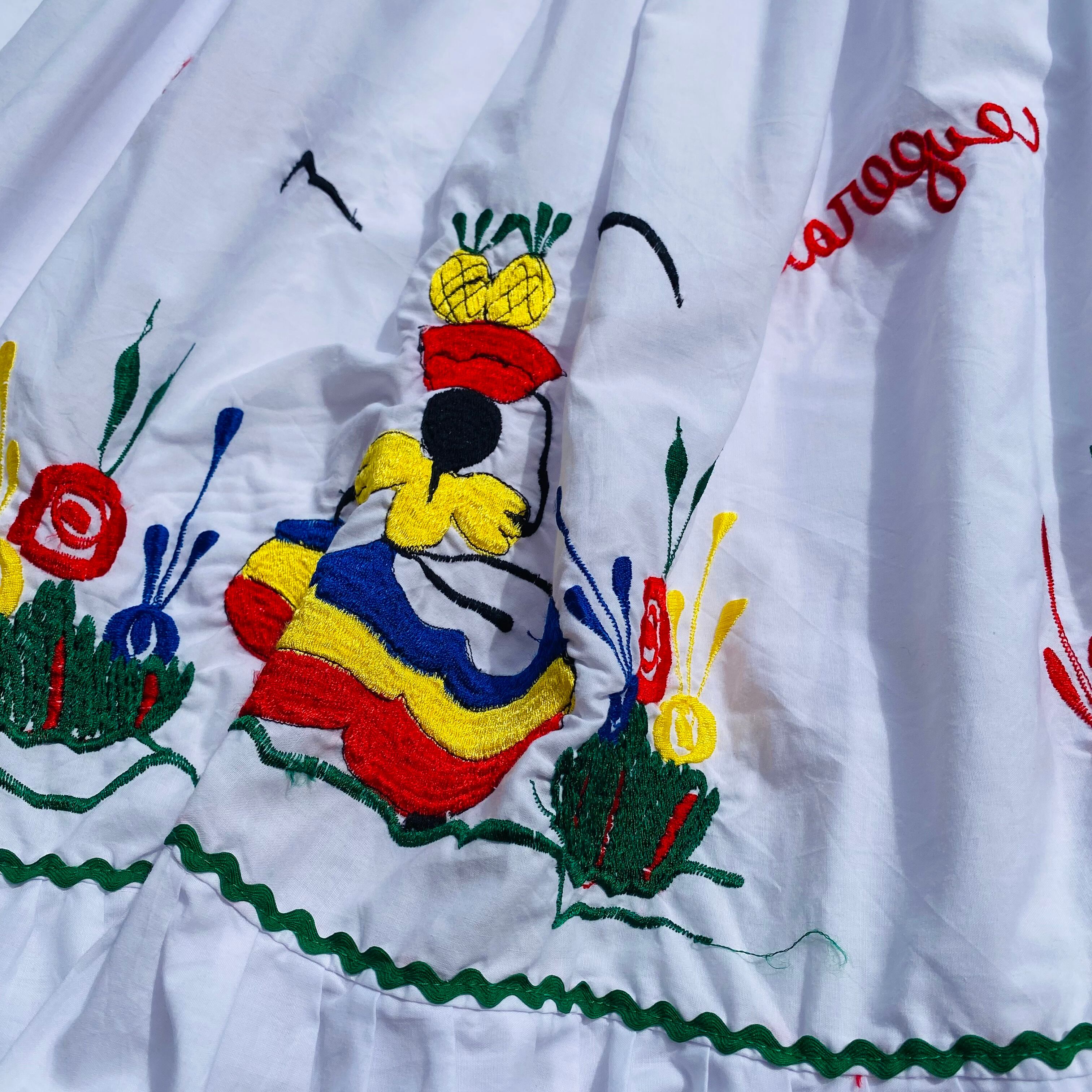 カラフルな人や楽器、フルーツなどの刺繍が