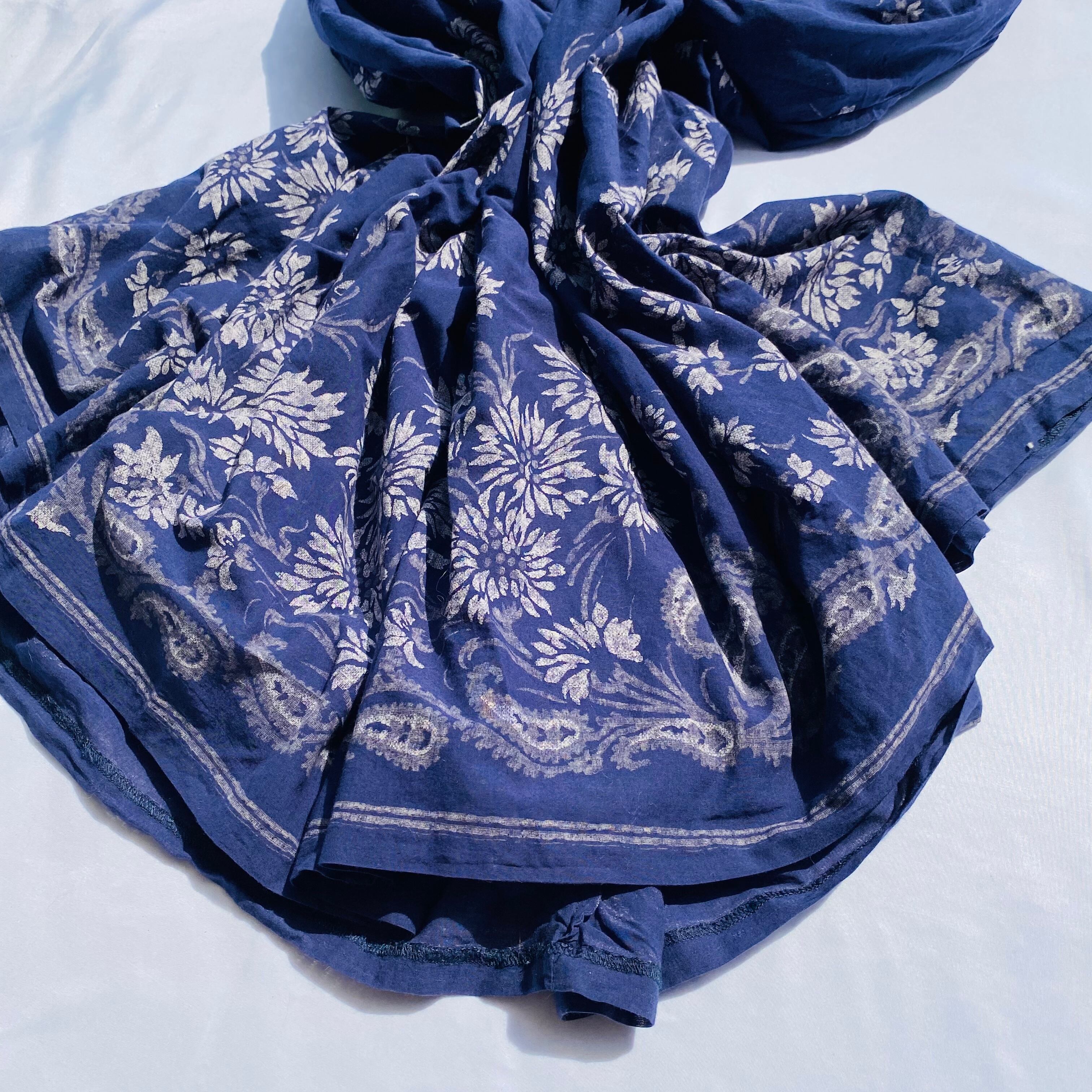 ネイビーベースに、ペイズリーと裾にむかって広がる白い花々のテキスタイルが綺麗なサマードレスです。