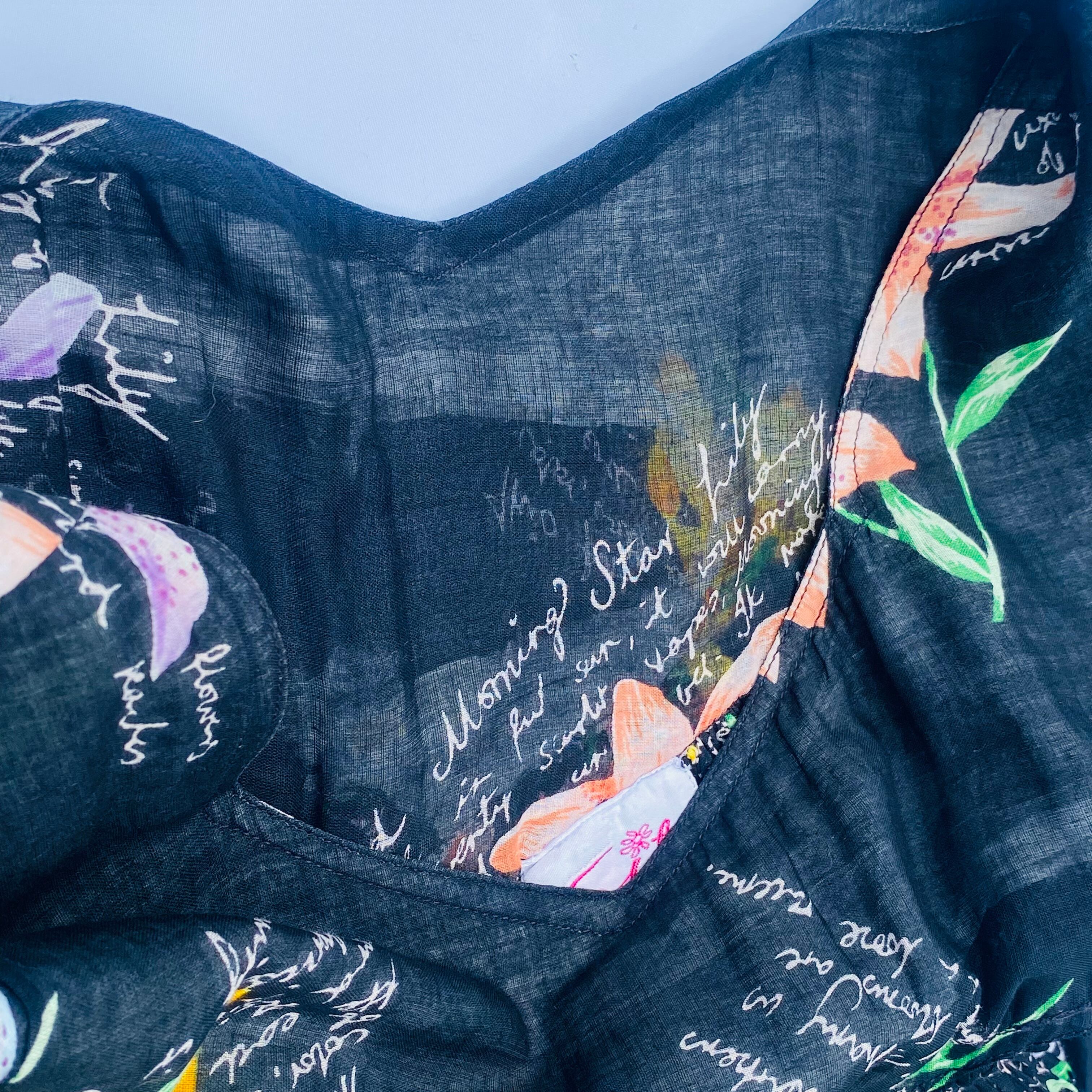 ブラックベースにカラフルな花と文字の総柄がかわいく、ボリュームたっぷりのふんわりうすいコットン素材はとっても気持ち良いです。