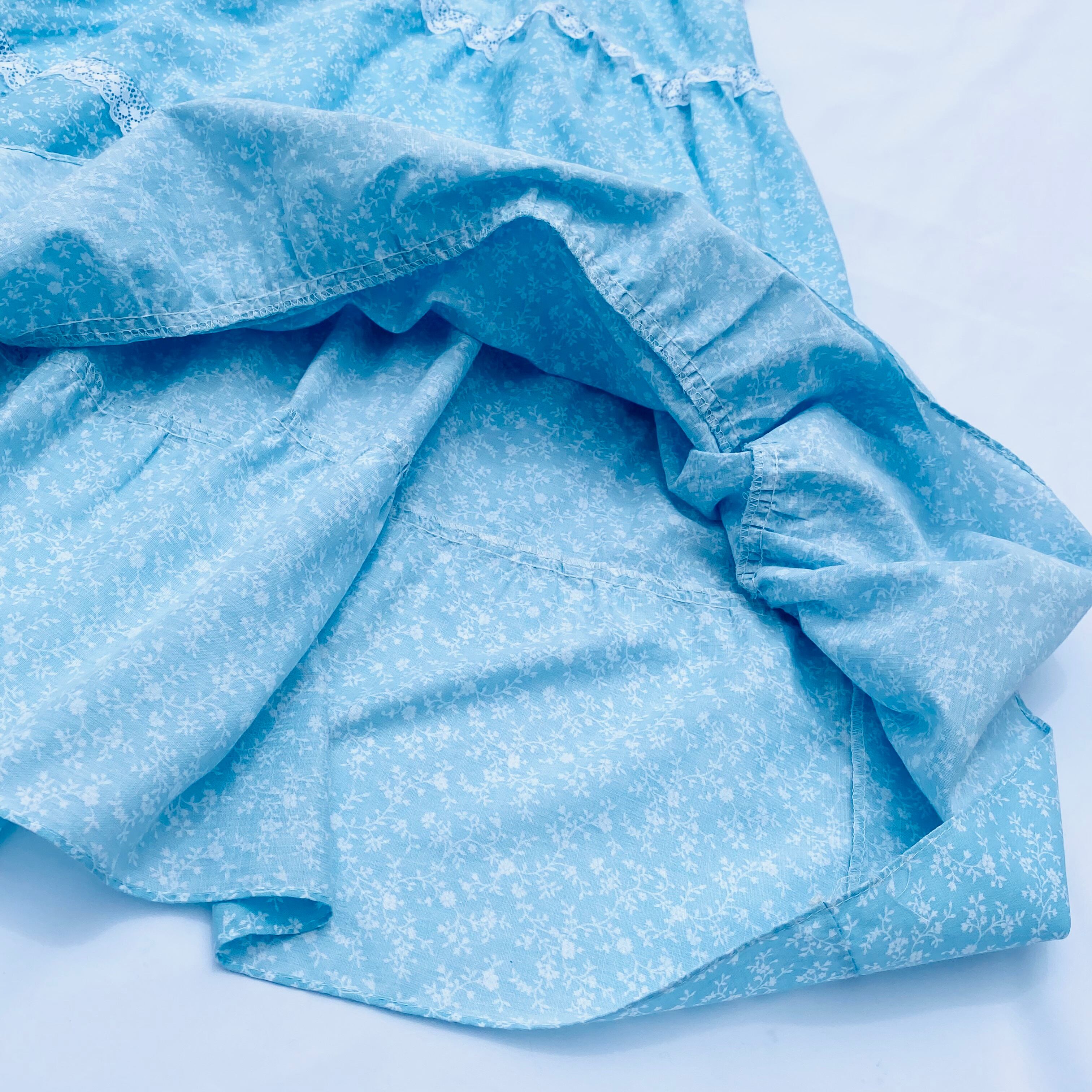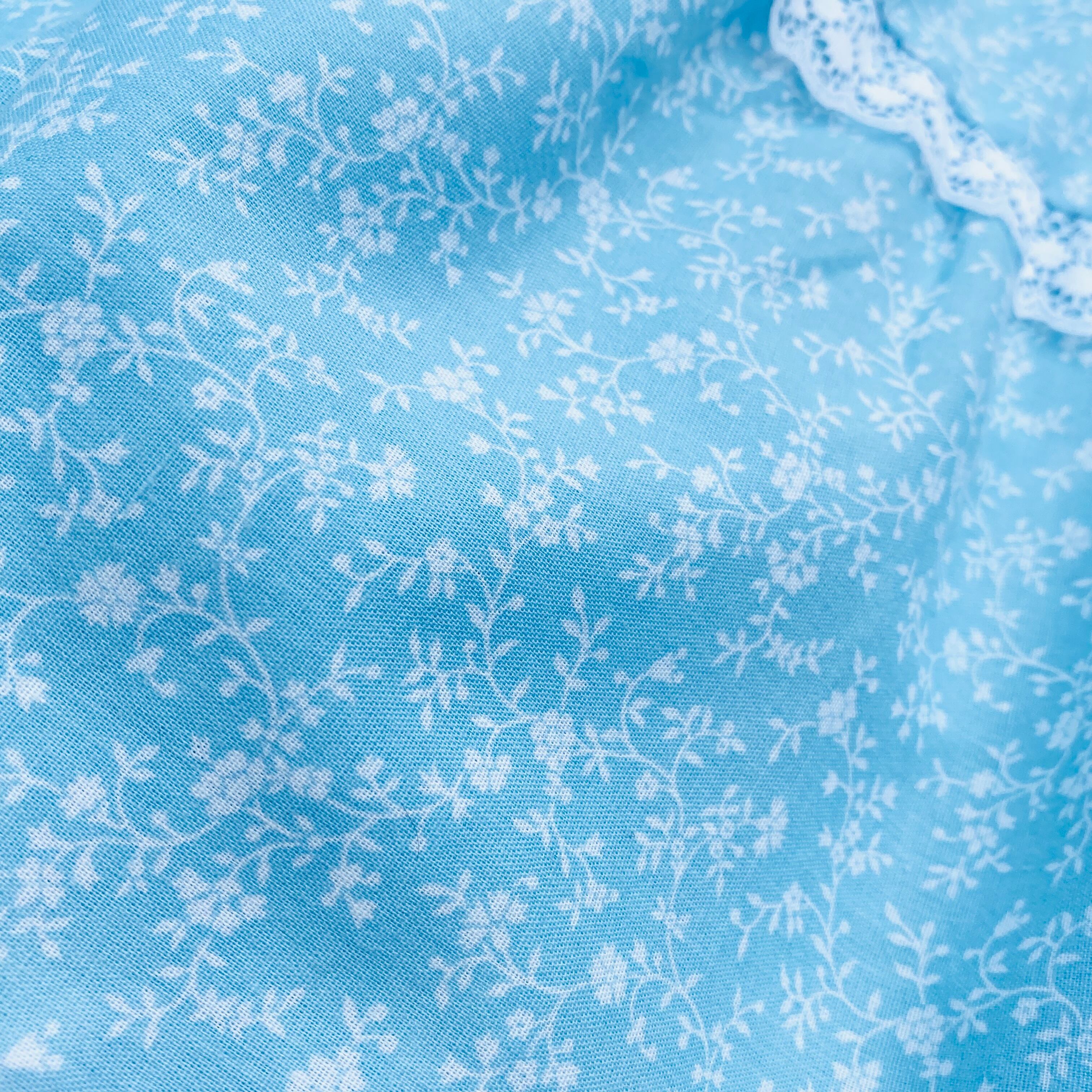 ライトブルーベースにホワイトの細かい花柄やレースなどガーリーな1枚です。