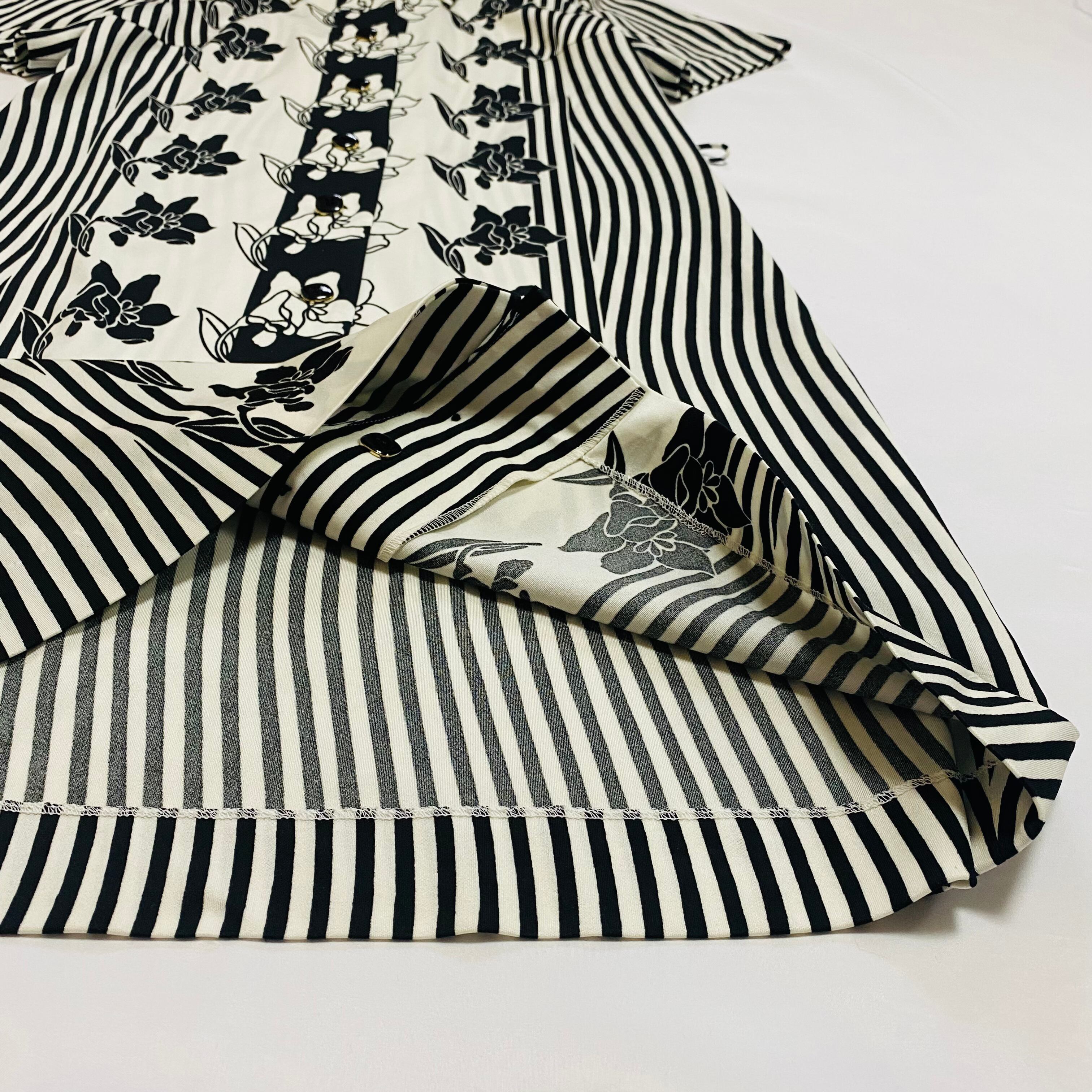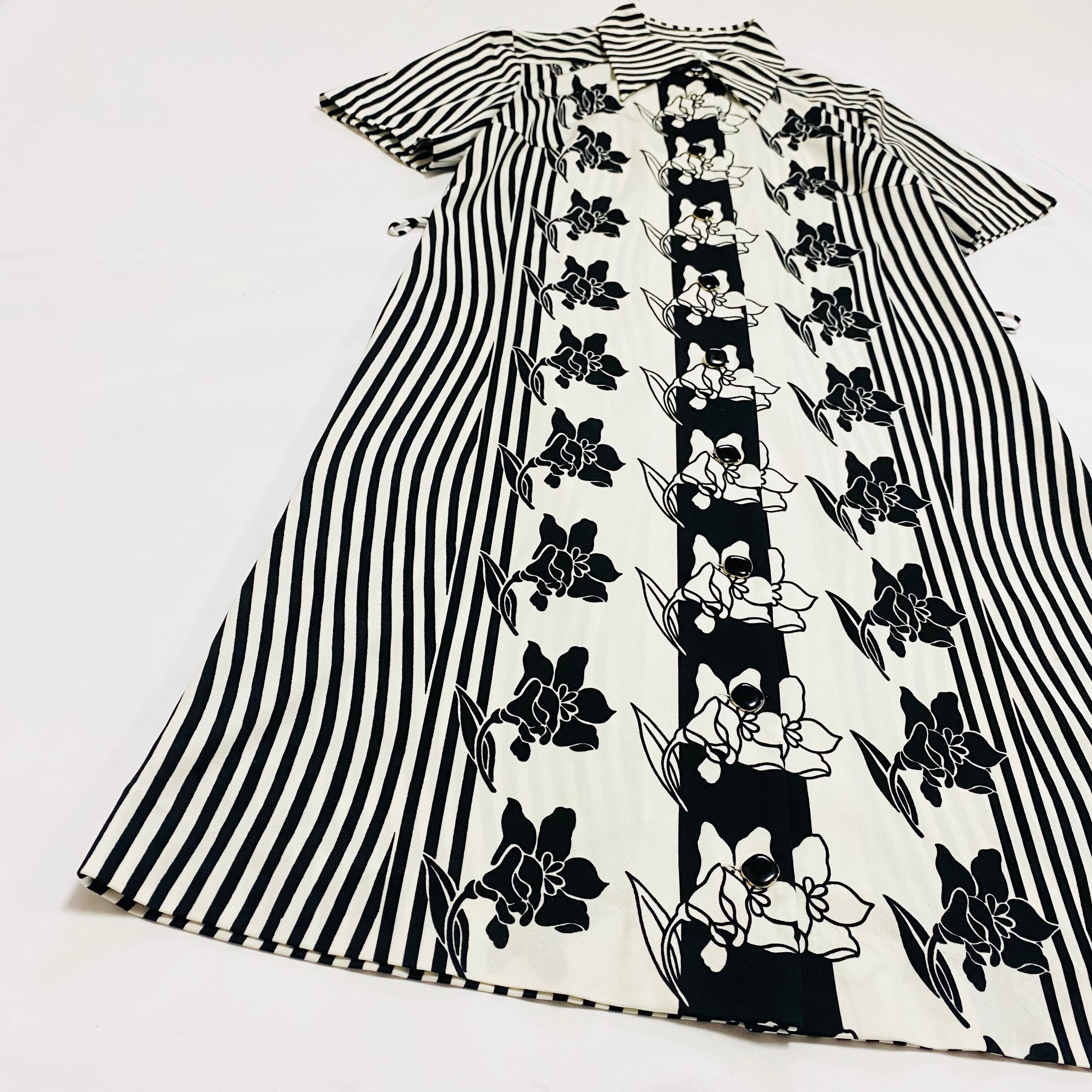 Japan monotone flower&stripe one-piece / 古着 昭和レトロ 花柄 ワンピース